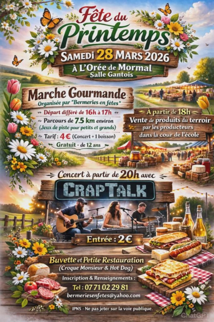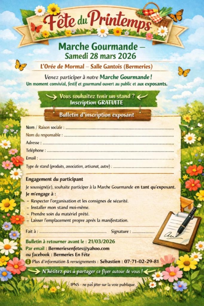Le samedi 28 mars 2026, rendez-vous à l’Orée de Mormal – Salle Gantois – pour une journée conviviale et festive à l’occasion de la Fête du Printemps !