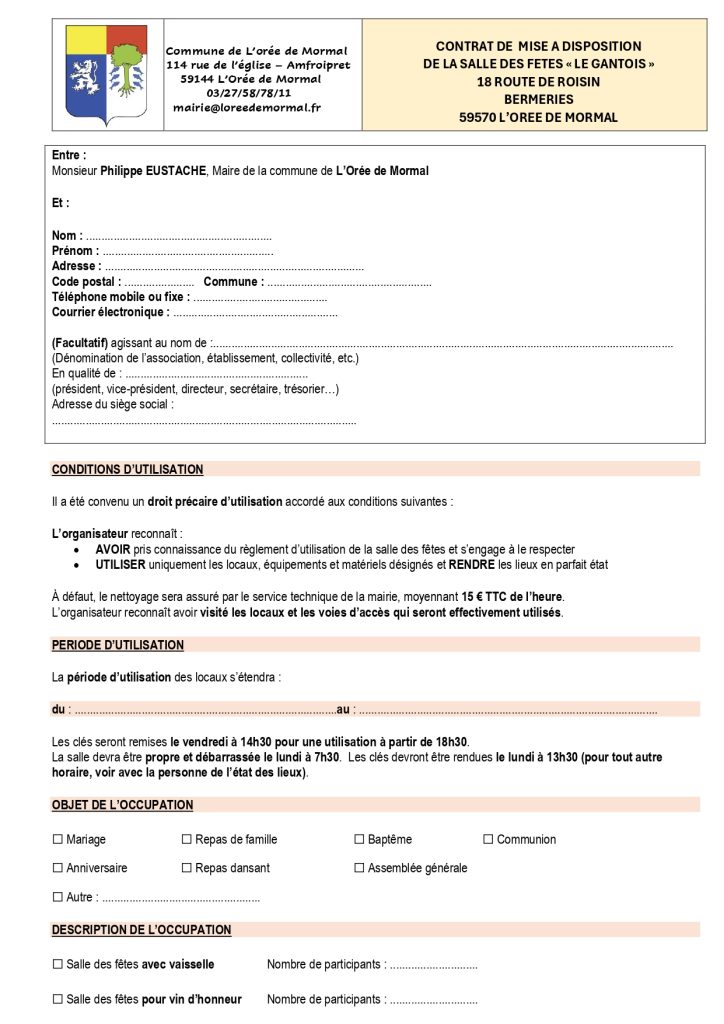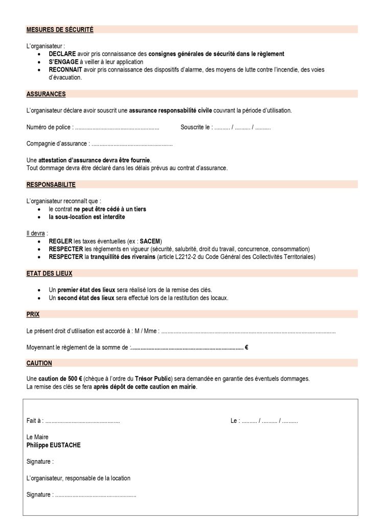 La réservation ne sera effective qu’après avoir déposé en mairie tous les documents (contrat, attestation d’assurance et chèque de caution) et vous sera confirmée.
